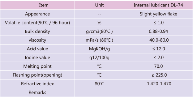 DL-74 為聚氯乙烯加工用外潤(rùn)滑劑,特別適用于軟/硬PVC粒料,透明片材、板材、收縮膜,壓延膜的加工。它可使物料塑化時(shí)間延長(zhǎng),降低平衡扭矩,增強(qiáng)脫模效果,改善制品的表面光滑度。添加量一般為0.3-0.8份(透明),0.3-1.2(不透明),特殊情況下可適當(dāng)增加