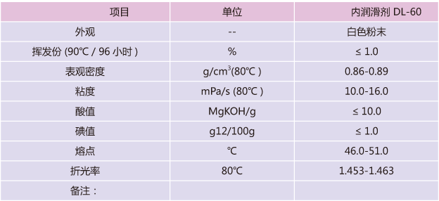 DL-60 作為硬聚氯乙烯制品加工用潤(rùn)滑劑,與PVC及其他助劑有著良好的相容性,適用于各種加工條件,能促進(jìn)熔體均勻塑化,改善沖擊強(qiáng)度及表面光澤度,可廣泛應(yīng)用于透明片、粒料、型材、板材、管材中,添加量一般為0.3-1.2份,特殊情況下適當(dāng)增加。